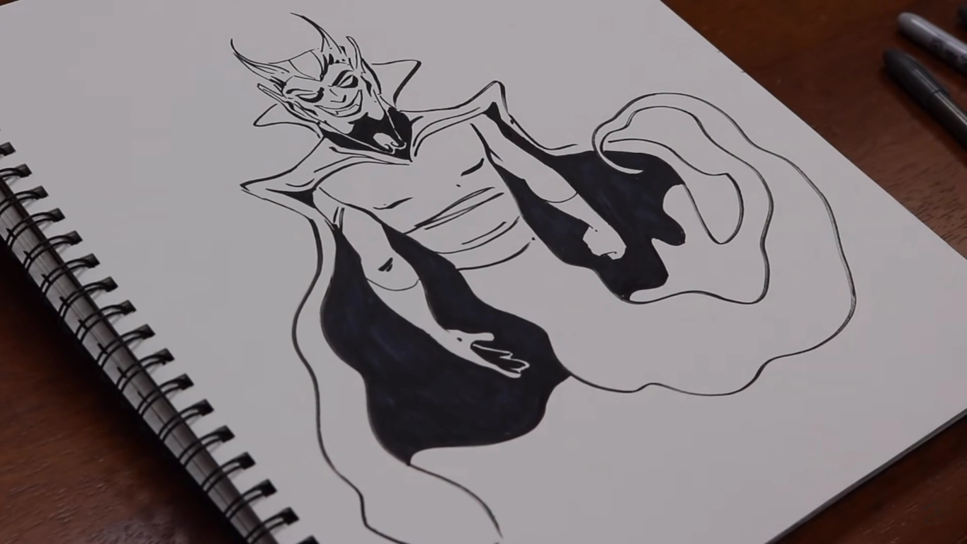His hair is tied into a ponytail and he has a matching goatee. However, he has black eyebrows and a pointed nose. He has midnight blue eyes and his eyes are heavily outlined in black, showing his dark nature and implying that he maybe wears eyeliner. He typically wears a black suit with a red handkerchief in his left breast pocket and a matching red bolo tie. The suit has three rows of white buttons, a total of six. He also wears a white undershirt and black pointed shoes.
